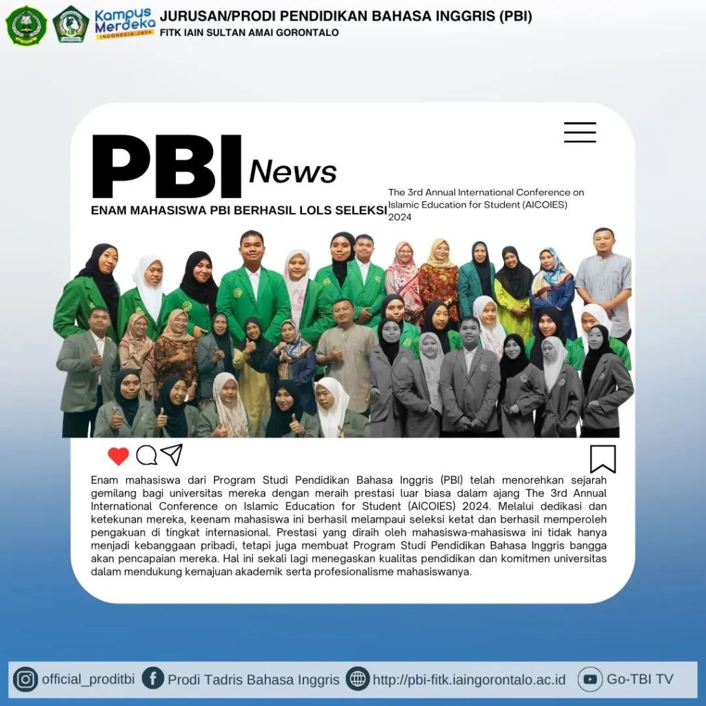 Gorontalo, 2 Mei 2024 – Enam mahasiswa Program Studi Pendidikan Bahasa Inggris dari Institut Agama Islam Negeri (IAIN) Sultan Amai Gorontalo berhasil lolos seleksi untuk mengikuti The 3rd Annual International Conference on Islamic Education for Students (AICOIES) 2024. Acara bergengsi ini diselenggarakan di UIN Sulthan Thaha Saifuddin Jambi pada 2 Mei 2024 dan dihadiri oleh peserta dari berbagai PTKIN.
