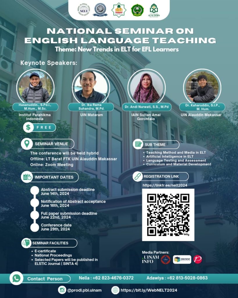 Makassar, 29 Juni 2024 – Ketua Jurusan Pendidikan Bahasa Inggris (PBI) IAIN Sultan Amai Gorontalo, Dr. Andi Nurawati, S.S., M.Pd., tampil sebagai keynote speaker dalam kegiatan The 2nd National Seminar on English Language Teaching (NELT 2024) yang diselenggarakan oleh UIN Alauddin Makassar. Seminar yang bertema “New Trends in ELT and EFL” ini dilaksanakan secara hybrid, dengan sesi online melalui Zoom Meeting dan sesi offline bertempat di Lt Barat Fakultas Tarbiyah dan Keguruan UIN Alauddin Makassar.