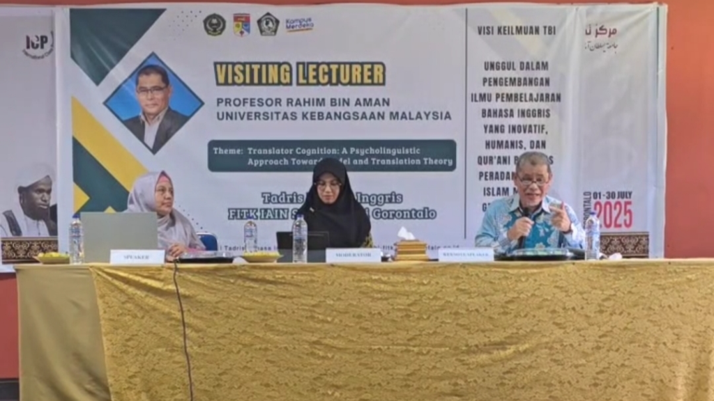 Kuliah umum kali ini mengangkat tema “Translator Cognition: A Psycholinguistic Approach Toward Model and Translation Theory” dengan menghadirkan dua pemateri, yakni Dr. Marina Pakaja, S.S., M.Hum. (dosen TBI IAIN Sultan Amai Gorontalo) dan Prof. Dr. Rahim bin Aman (Universiti Kebangsaan Malaysia). Sementara itu, sesi diskusi dipandu oleh Andiani Rezkita Nabu, S.Pd., M.A. yang bertindak sebagai moderator.