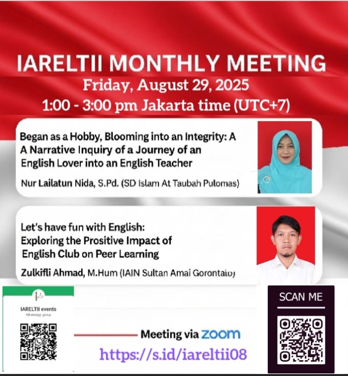 Gorontalo, 29 Agustus 2025 – IARELTII Monthly Meeting yang digelar pada Jumat, 29 Agustus 2025 menghadirkan narasumber dari berbagai lembaga pendidikan. Salah satu yang menarik perhatian peserta adalah pemaparan dari Zulkifli Akhmad, M.Hum, dosen IAIN Sultan Amai Gorontalo, dengan topik “Let’s Have Fun with English: Exploring the Positive Impact of English Club on Peer Learning.”